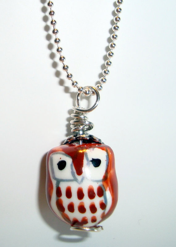 This little ceramic owl has been hung on a sterling silver chain that is 24 inches long.